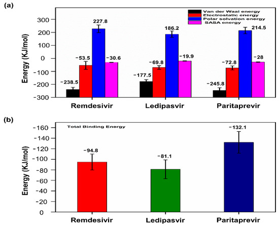 The MM-PBSA method was employed to calculate the binding free energy from the trajectory obtained during MD simulation. For each protein–ligand complex, binding free energy (∆Gbind), van der Waals energy, electrostatic energy, and polar solvation energy were calculated as shown in Figure 7a. It has been observed in previous studies that binding free energy values lower than −30 kJ/mol can be taken for binding, but lower binding free energy values are considered to be more favorable for the interaction [57,58]. In the current study, RdRp-drugs (remdesivir, ledipasvir, and paritaprevir) showed acceptable binding free energy values as shown in Figure 7b. The cumulative binding energy contributed for selected drugs remdesivir, ledipasvir, and paritaprevir were −94.877, −81.18, and −132.108 kJ/mol respectively. In all three complexes, the van der Waals interactions significantly contributes in the binding energy. Overall, our analysis established that the selected drugs have the potential to bind tightly to the SARS-CoV2 RdRp protein.