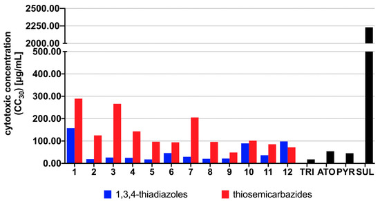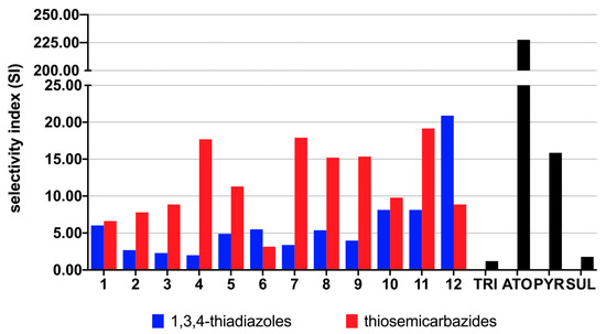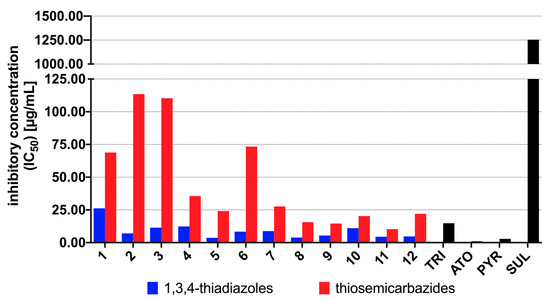- Paneth, A.; Weglinska, L.; Bekier, A.; Stefaniszyn, E.; Wujec, M.; Trotsko, N.; Hawrył, A.; Hawrył, M.; Dzitko, K. Discovery of potent and selective halogen-substituted imidazole-thiosemicarbazides for inhibition of Toxoplasma gondii growth in vitro via structure-based design. Molecules 2019, 24, 1618. [Google Scholar] [CrossRef] [PubMed]