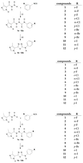 - Siwek, A.; Wujec, M.; Dobosz, M.; Wawrzycka-Gorczyca, I. Study of direction of cyclization of 1-azolil-4-aryl/alkyl-thiosemicarbazides. Heteroat. Chem. 2010, 21, 521–525. [Google Scholar] [CrossRef]