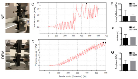 The mechanical properties of NE and DEM. (A) NE and (B) DEM mounted on the Instron structural testing machine. A representative mechanical stress–strain curve for NE (C) and DEM (D). (E) Young’s modulus of NE and DEM (n = 9) (p = 0.23). (F) Max load of NE and DEM (n = 9) (p = 0.11). (G) The stiffness of NE and DEM (n = 9) (p = 0.07).