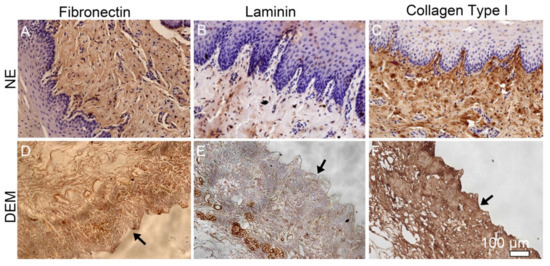 The immunohistochemical staining of three components of matrix: fibronectin, laminin, and collagen type I on NE (A–C) and DEM (D–F) (black arrows show the luminal surface).