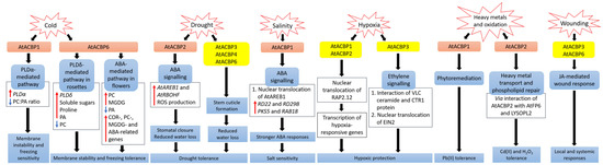 Plants are sessile, and therefore possess signalling and adaptive mechanisms to counteract abiotic and biotic stresses including cold, drought, salinity, oxidation, heavy metals, hypoxia and pathogen attack. Given the importance of plant ACBPs in development and stress responses, the roles of all Arabidopsis and rice ACBPs at different stages of plant growth were previously summarized by Du et al. [138] and are now updated (Table 2). Studies on the binding by ACBPs of acyl-CoA esters, membrane lipids and protein interactors have provided insights into the mechanistic events that occur when plants are exposed to various abiotic stresses (Figure 1).