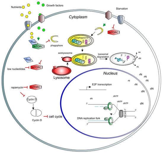 A model depicting the role of mTORC1 in the cell cycle and nuclear activity regulation. Growth factors (light green hexagons) and nutrients (yellow hexagons) enter the cell through the membrane channels or bind and activate membrane receptors (brown and gray shapes), activating the mTORC1 complex (green long hexagon) via Rheb (blue rhomboid). Activated mTORC1 inhibits catabolic pathways, such as autophagy and lysosomal degradation. Upon starvation, mTORC1 is inhibited (red long hexagon) and autophagy can be triggered. Early stages of autophagy involve phagophore formation (yellow half-circle), followed by the formation of the autophagosome containing trapped cargo (yellow oval). The lysosome (red oval) then fuses with the autophagosome to form the autolysosome (red and yellow oval). Finally, the cargo is degraded, and recycled products are released to the cytosol for further use (aa = amino acids, rN = ribonucleosides, dN = deoxyribonucleosides). In the nucleus, nucleosides are converted to ribonucleotide triphosphates and deoxyribonucleotide triphosphates (dNTP) to be used for transcription and DNA synthesis, respectively. In the nucleus, a basic unit of DNA synthesis, called replication fork, is depicted. Newly synthesized DNA is shown as blue lines, the DNA polymerase complex is shown as green octagons and the DNA helicase complex MCM2-7 is shown as a grey barrel. A low level of nucleotides inhibits mTORC1. Rapamycin inhibits also mTORC1 activity, which induces degradation and accumulation of the D-type cyclins, negatively affecting the cell cycle progression. As a result, transcription of E2F and its target genes is inhibited. E2F activity is necessary for the transcription of genes involved in deoxynucleotide metabolism.