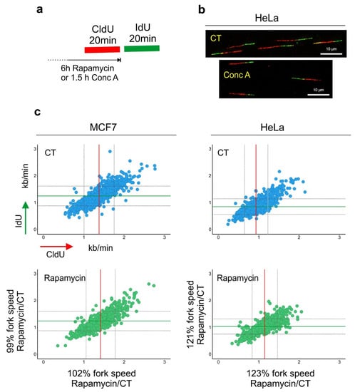 Lysosomal function and DNA replication fork progression. (a) An experimental diagram of the DNA replication fork speed analysis. (b) Representative images of double-labeled DNA fibers are shown. Cells were pulse-labeled with CldU (red) for 20 min, washed with the medium and pulse-labeled with IdU (green) for a subsequent 20 min. Cells were lysed and their DNA was stretched. Nucleosides were detected with antibodies, and the length of CldU and IdU pulses (µm) was converted into kb/min as in []. Before the labeling, cells were incubated for 6 h with rapamycin (100 nM). (c) The length of every replication fork was converted into kb/min and is plotted on the graphs. Dataset for MCF7 cells was taken from []. Control (CT) mean fork speed: CldU = 1.37 kb/min and IdU = 1.25 kb/min; number of scored forks: n = 758. Rapamycin-treated mean fork speed: CldU = 1.41 kb/min and IdU = 1.24 kb/min; number of scored forks: n = 557. HeLa cells, control (CT) mean fork speed: CldU = 0.93 kb/min and IdU = 0.85 kb/min; number of scored forks: n = 825. Rapamycin-treated mean fork speed: CldU = 1.14 kb/min and IdU = 1.03 kb/min; number of scored forks: n = 544. The red line indicates the mean fork speed of the CldU pulse, and the green line indicates the mean fork speed of the IdU pulse. Grey lines indicate SD. Indicated percentages of the fork speed were obtained by calculating the fork speed ratio control/rapamycin. Rapamycin treatment accelerated the speed of fork progression in HeLa cells.