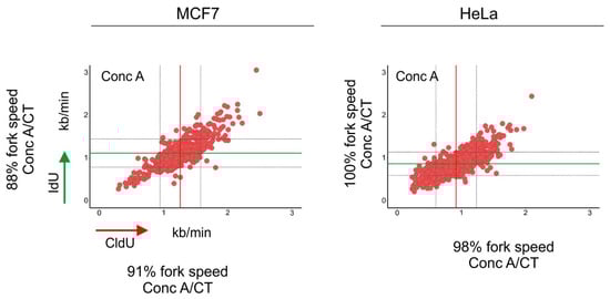 Inhibition of autophagic flux reduced the speed of DNA replication fork progression. Cells were pulse-labeled with CldU (red) for 20 min, washed with the medium and pulse-labeled with IdU (green) for a subsequent 20 min. Cells were lysed and their DNA was stretched. Nucleosides were detected with antibodies, and the length of CldU and IdU pulses (µm) was converted into kb/min as in []. Before the labeling, cells were incubated for 1.5 h with concanamycin-A (Conc A; 2 nM). The length of every replication fork was converted into kb/min and is plotted on the graphs. Dataset for MCF7 cells was taken from []. Conc A-treated mean fork speed: CldU = 1.25 kb/min and IdU = 1.11 kb/min; number of scored forks: n = 615. HeLa cells, Conc A-treated mean fork speed: CldU = 0.91 kb/min and IdU = 0.86 kb/min; number of scored forks: n = 751. The red line indicates the mean fork speed of the CldU pulse, and the green line indicates the mean fork speed of the IdU pulse. Grey lines indicate SD. Indicated percentages of the fork speed were obtained by calculating the fork speed ratio control/concanamycin-A. Control values of the fork speed from untreated cells are shown in Figure 2. Concanamycin-A treatment reduced the speed of fork progression in MCF7 cells.