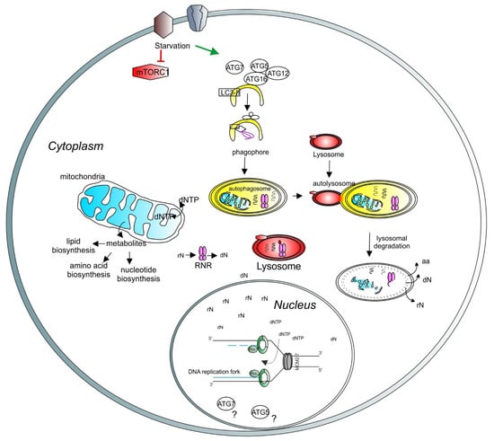 A model depicting the role of lysosomes and autophagy in DNA synthesis and transcription. Lysosomal function is regulated by mTORC1 (red hexagons). Under starvation, autophagy is initiated by ATG proteins (empty circles) and LC3-related processes (empty square) to form the phagophore (yellow half-oval). The cargos are engulfed in the autophagosome, which then fuses with the lysosome to create the autolysosome, where the cargos are degraded. Recycled molecules are released to the cytoplasm for further use. Defective cellular organelles, such as mitochondria (blue shape), can be also targeted for degradation by autophagy. Healthy mitochondria contribute to the correct balance of intracellular metabolites. Intracellular nucleotide pools (ribonucleotides (rNTP) and deoxyribonucleotides (dNTP)) are important for maintaining adequate levels of DNA synthesis and transcription. Lysosomes can directly target the ribonucleotide reductase (RNR, pink shape) for degradation, thus regulating the deoxynucleotide level. A basic unit of DNA synthesis, called replication fork, is shown with DNA polymerases (green shapes) and the helicase MCM2–7 (grey shapes). The role of autophagy-related proteins, such as ATG5 and ATG7, in the regulation of the nuclear function requires further investigation (question marks).