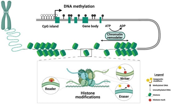 Schematic of the mechanisms of epigenetic regulation. DNA methylation, histone modifications and chromatin remodeling represent three different kinds of epigenetic mechanisms. Main players in the histone modification machinery are depicted in the inset. Proteins that covalently attach chemical groups to the histone tails are termed writers, whereas the so-called readers can recognize and bind to histone modifications. Enzymes that remove histone marks are termed erasers. DNA methylation is found across different genomic elements. For example, CpG islands, which are often found in the proximity of promoters, are usually depleted of methylation, whereas gene bodies are heavily methylated. The chromatin structure is controlled by chromatin remodeler complexes that use the hydrolysis of ATP to mediate the packaging of the chromatin. Created with BioRender.com.