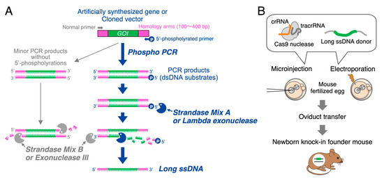 Schematic diagram of knock-in mouse generation using long ssDNA donors prepared by the phospho-PCR method. (A) Flowchart of the phospho-PCR method. A dsDNA template containing a gene cassette of interest (GOI) flanked by homology arms on both sides is depicted at the top. A pair of normal primer and 5′-phospholyrated primer for PCR is used to amplify the starting dsDNA substrates for exonuclease reactions. Strandase Mix A or Lambda exonuclease selectively degrades the phosphorylated chains of the duplex. Strandase Mix B or Exonuclease III subsequently help complete the selective degradations to yield long ssDNAs. Minor PCR products without 5′-phosphorylations are also extensively digested by Exonuclease III activities, whose efficiency is detailed in Results Section 3.2. Note that this sequential use of two exonucleases enables highly pure ssDNA production. (B) Schematic of CRISPR/Cas9 mediated knock-in mouse generation using long ssDNA donors. Long ssDNA donor and Cas9-guide RNA complex can be introduced into mouse fertilized eggs either by pronuclear injection or by electroporation. Treated eggs are transferred into the oviduct of pseudo-pregnant recipients to obtain knock-in founders.
