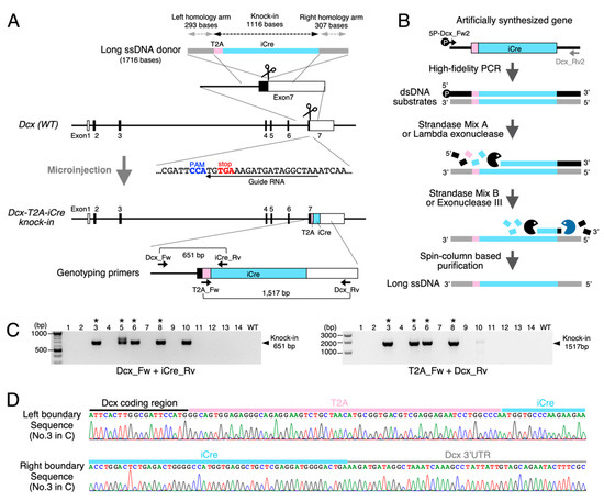 In the present study, we chose the mouse Dcx locus on chromosome X as a main model site for Cre recombinase sequence insertion to optimize the phospho-PCR-mediated long ssDNA donor production (Figure 2A). As Dcx was reported to express in immature newborn neurons [26,27], its recombinase driver mouse line could be utilized to manipulate variety of exogenous gene expressions by combining with Cre-dependent viral vectors to examine the effects on neural circuit development and higher-order brain functions.