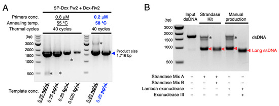 Purely amplified PCR products and the following sequential use of two exonucleases enabled high-quality ssDNA production. (A) Optimization of PCR conditions to obtain a clear single product was the first key step for phospho-PCR-mediated ssDNA production. Primers’ concentrations, annealing temperature, and templates’ concentration for the PCR reaction depicted in Figure 2B were optimized. The manufacturer’s protocols are underlined, and our optimized conditions are colored in blue. To obtain a single product with high efficiency, the primers’ concentrations should be lower, the annealing temperature should be higher, and the templates’ concentration should be much lower than the manufacturer’s instructions. Asterisks (*) indicate the unwanted non-specific amplifications. Blue triangle indicates the purely amplified products. (B) Sequential use of two exonucleases depicted in Figure 2B allowed for highly pure long ssDNA production. While the single use of Strandase Mix A or Lambda exonuclease selectively degraded 5′-phosphorylated strands to yield ssDNAs (red triangles), dsDNA substrates indicated by asterisks remained in the reaction mixtures. Subsequently added Strandase Mix B or Exonuclease III degraded the remaining dsDNAs to yield pure long ssDNAs. Note that the long ssDNA treated with Exonuclease III was slightly shorter than that treated with Strandase Mix B.