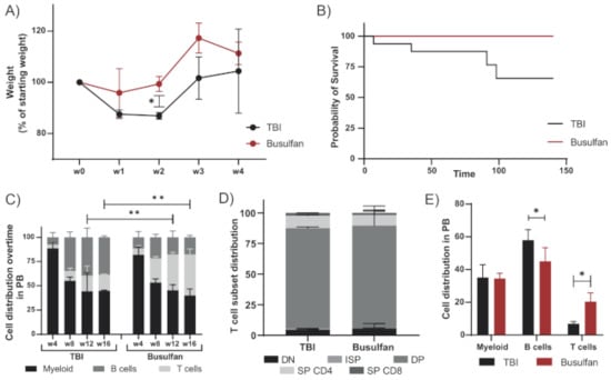 The standard preconditioning method in mice for hematopoietic stem cell (HSC) transplantation is total body irradiation (TBI), varying the irradiation dose depending on the mouse strain. Rag2−/− mice were transplanted with wild-type BALB/c hematopoietic and progenitor stem cells (HSPCs) after conditioning with TBI (8.09 Gy) or busulfan (50 mg/kg) as previously published for immunodeficient mice [23,24]. Improved welfare and well-being of the animals was observed for mice preconditioned with busulfan compared to TBI, with a lower loss of weight and a faster recovery after transplantation (Figure 1A). The survival rate of busulfan-conditioned mice was higher than that of TBI-treated mice (Figure 1B), which died from irradiation side effects which require strict and careful animal support and can lead to high mortality rates [24]. In addition, busulfan-conditioned mice showed increased T-cell reconstitution from week 12 after transplantation, represented by a more significant population in the peripheral blood (PB) (Figure 1C). Although T-cell development in the thymus including all development stages was comparable between busulfan- and TBI-conditioned mice (Figure 1D), the T-cell output in PB at 20 weeks after transplantation was higher for busulfan-conditioned mice (Figure 1E).