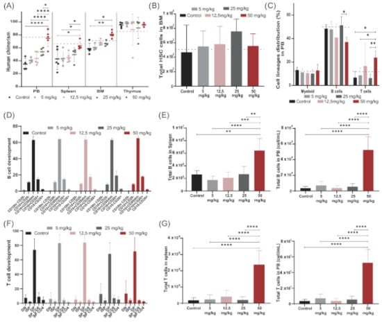 We first focused on setting the optimal busulfan dose in NSG mice to investigate the possibility of reducing busulfan conditioning before HSC transplantation to reduce associated side effects. A dose of 50 mg/kg busulfan was used as a starting dose [23,26,27,28], and reduced gradually to 5 mg/kg. Mice were preconditioned with different doses of busulfan (control without busulfan, 5 mg/kg busulfan, 12.5 mg/kg busulfan, 25 mg/kg busulfan and 50 mg/kg busulfan as described in Material and Methods) and transplanted intravenously with 1 × 105 CD34+ cells/kg isolated from cord blood (five mice/group). Human chimerism and human immune cell reconstitution were followed up to 20 weeks after transplantation (Supplementary Figure S1). Mice were sacrificed and immune organs were thoroughly analyzed for human HSC engraftment and human B- and T-cell development. Increasing levels of human chimerism were observed in PB, spleen and BM with increasing busulfan doses, with a significant increase in the group receiving the maximum dose (50 mg/kg) compared to the control group and the lower 5 mg/kg and 12.5 mg/kg doses (Figure 2A). As NSG thymi are devoid of murine cells, human engrafted cells completely repopulated the thymus in all dosing groups, showing close to 100% human chimerism in this organ. Although a comparable number of human HSCs were engrafted in BM across the groups (Figure 2B), the distribution of immune cell lineages in PB, mainly B and T cells, significantly differed for the highest dose compared to other groups, leading to a higher T-cell contribution (Figure 2C). All busulfan doses contributed to an overall normal B-cell development in BM (Figure 2D) and T-cell development in the thymus (Figure 2F) with a normal population distribution over the developmental stages. However, significantly higher B-cell (Figure 2E) and T-cell (Figure 2F,G) numbers were detected in the periphery (spleen and PB) with the highest dose, while following more moderate doses, immune output was comparable to that of control transplanted mice.