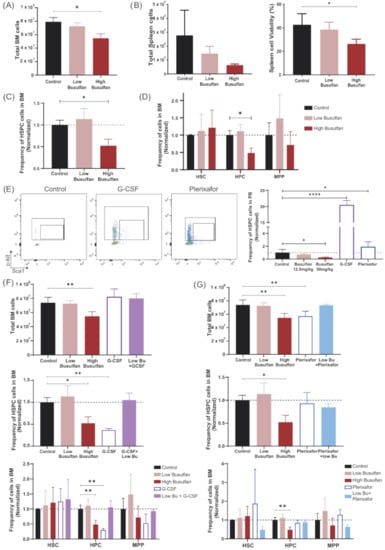 Effect of busulfan and mobilizing agents on BM HSCs. (A) Total BM cell numbers, 24 h after busulfan conditioning (low and high dose) compared to the control group (without busulfan). (One-way ANOVA, * p < 0.05). (B) Total spleen cell numbers and cell viability after busulfan conditioning (24 h after). (One-way ANOVA; * p < 0.05). (C) Frequency of HSPCs (LSK; Lin-Sca1 + cKit +) cells in BM 24 h after busulfan conditioning, normalized to control mice. (One-way ANOVA; * p < 0.05). (D) Frequency of long-term HSCs (Lin-Sca1+cKit+CD150+CD48-), hematopoietic progenitor cells (HPC; Lin-Sca1+cKit+CD48+) and multipotent progenitor cells (MPP; Lin-Sca1+cKit+CD150-CD48-). (Two-way ANOVA; * p < 0.05). (E) Representative FACS plots of PB HSPCs after mobilizing agents’ injection. G-CSF was measured 1 day after the last injection and plerixafor 1 h after injection. Quantification of HSPCs in PB is depicted in the graph. (One-way ANOVA; ** p < 0.01, **** p < 0.0001). (F) Mice were conditioned with busulfan (low and high dose), G-CSF or the combination G-CSF+low-dose busulfan and analyzed 24 h after the last injection (3 mice/group). Upper graph: Total BM cell count after conditioning. (One-way ANOVA; ** p < 0.01). Middle graph: Frequency of HSPC (LSK; Lin-Sca1+cKit+) cells in BM 24 h after conditioning, normalized to control mice. (One-way ANOVA; * p < 0.05, ** p < 0.01). Lower graph: Frequency of long-term HSCs, HPC and MPP cells. (Two-way ANOVA; ** p < 0.01). (G) Mice were conditioned with busulfan (low and high dose), plerixafor or the combination plerixafor+low-dose busulfan and analyzed after the last busulfan injection or 1 h after plerixafor administration (3 mice/group). Upper graph: Total BM cell count after conditioning. (One-way ANOVA; ** p < 0.01). Middle graph: Frequency of HSPC (LSK; Lin-Sca1+cKit+) cells in BM 24 h after conditioning, normalized to control mice. (One-way ANOVA; * p < 0.05). Lower graph: Frequency of long-term HSC, HPC and MPP cells. (Two-way ANOVA; ** p < 0.01).