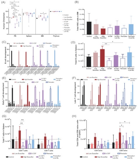 Long-term immune recovery after reduced busulfan conditioning. NSG mice (5 mice/group) were preconditioned with different conditioning regimens (low-dose busulfan, high busulfan, G-CSF, G-CSF+low-dose busulfan, plerixafor and plerixafor+low-dose busulfan) and transplanted with 100,000 CD34 enriched cells from cord blood. (A) Achieved human chimerism (% hCD45 cells) in PB, spleen, bone marrow (BM) and thymus 20 weeks after transplantation. (Two-way ANOVA; * p < 0.05, *** p < 0.001, **** p < 0.0001). (B) Total number of human hematopoietic stem cells (HCS) in NSG BM 20 weeks after transplantation. (C) Proportion of B-cell developmental stages in BM in the different conditioned regimen groups. (D) Total B cell counts in spleen 20 weeks after transplantation. (One-way ANOVA; * p < 0.05; ** p < 0.01). (E,F) Proportional T-cell developmental stages (early and late) in the thymus in the different conditioning regimen groups. (G) Total T-cell numbers (CD4+ and CD8+ cells) in spleen 20 weeks after transplantation. (Two-way ANOVA; ** p < 0.01). (H) Total naïve T-cell numbers (CD4+ and CD8+ cells) in spleen 20 weeks after transplantation. (Two-way ANOVA; * p < 0.05).