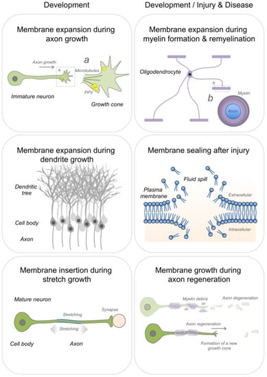 - Pfenninger, K.H. Plasma membrane expansion: A neuron’s Herculean task. Nat. Rev. Neurosci. 2009, 10, 251–261. [Google Scholar] [CrossRef]