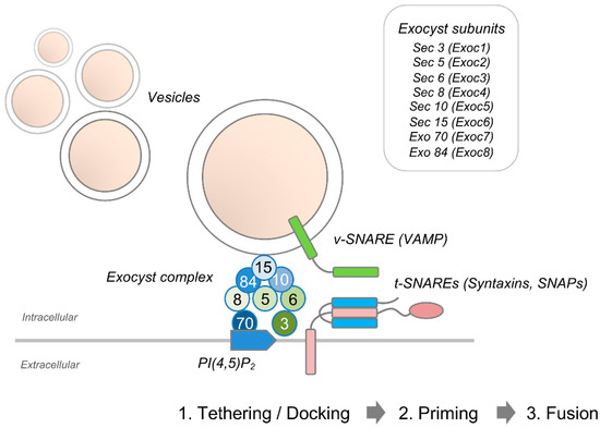 - Boyd, C.; Hughes, T.; Pypaert, M.; Novick, P. Vesicles carry most exocyst subunits to exocytic sites marked by the remaining two subunits, Sec3p and Exo70p. J. Cell Biol. 2004, 167, 889–901. [Google Scholar] [CrossRef] [PubMed]