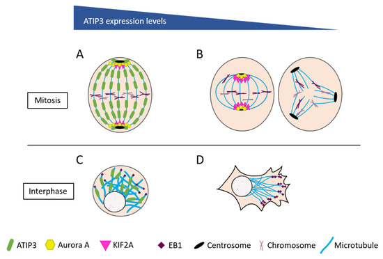 A major step towards the understanding of ATIP3-associated molecular mechanisms was recently provided by a proteomic approach that aimed at identifying intracellular interacting partners of ATIP3 in breast cancer cells. Co-immunoprecipitation experiments followed by mass spectrometry led to the identification of 145 ATIP3-interacting proteins, among which, nine were related to the microtubule cytoskeleton and/or mitosis [51]. Interestingly, ATIP3 interacts with KIF2A—a microtubule depolymerizing kinesin of the KinI family—and its regulator, Dda3, via a minimal sequence of 112 amino-acids present in the central basic region of the protein. The ATIP3/KIF2A/Dda3 complex prevents the accumulation of KIF2A at the poles of the mitotic spindle, and therefore controls microtubule depolymerization and spindle dynamics at minus ends (Figure 1). As a consequence, ATIP3 regulates the microtubule poleward flux—a mechanism of concerted polymerization at plus ends and depolymerization at minus ends of the spindle—that takes place in metaphase to maintain a constant size of the mitotic spindle [52]. In ATIP3-depleted cells, the mitotic spindle is significantly shortened [51]. This mitotic abnormality, among others, is expected to provoke major defects in chromosome segregation and subsequent aneuploidy.
