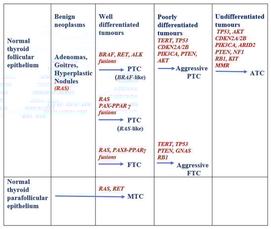 Genetic alterations involved in the evolution of thyroid cancers. Figure adapted from Pozdeyez et al. []. Rat sarcoma (RAS). V-raf murine sarcoma viral oncogene homolog B1(BRAF). Rearranged during transfection (RET). Anaplastic lymphoma kinase (ALK). Paired box gene 8-peroxisome proliferator-activated receptor (PAX8-PPARγ). Telomerase reverse transcriptase (TERT). Tumour protein 53 (TP53). Cyclin-dependent kinase inhibitor 2A/2B (CDKN2A/2B). (PIK3CA). Phosphatase and tensin homolog (PTEN). Ak strain transforming (AKT). Guanine nucleotide binding protein, alpha stimulating activity polypeptide (GNAS). Retinoblastoma1 (RB1). AT-rich interactive domain-containing protein 2 (ARID2). Neurofibromatosis1 (NF1). V-kit Hardy-Zuckerman 4 feline sarcoma viral oncogene homolog (KIT). Mismatch repair (MMR). Papillary thyroid carcinoma (PTC). Follicular thyroid carcinoma (FTC). Medullary thyroid carcinoma (MTC). Anaplastic thyroid carcinoma (ATC).
