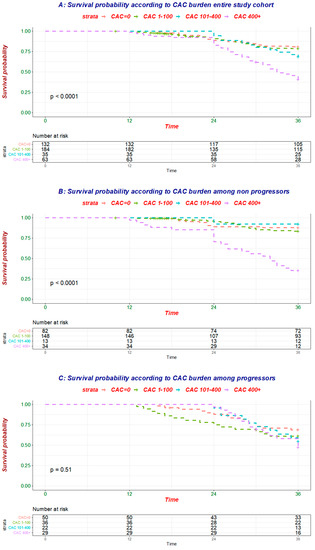 Survival probability according to baseline coronary artery calcification (CAC) in the entire study cohort (A) as well as patients without (B) and with (C) evidence of CAC progression during the first 12 months of follow-up.