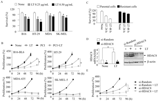 We first examined the cytotoxic effect of LT in four cancer cell lines with known mutations in the signaling axis of RAS-RAF-MEK1/2: murine melanoma B16-BL6, human colorectal cancer HT-29, and human melanoma MDA-MB-435 (MDA) [19] and SK-MEL-5 (SK-MEL) cell lines [6,20,21,22,23]. LT was able to decrease cell survival within 24 h in these cells (Figure 1A). To further examine whether the decreased cell survival was due to cell death or cell cycle arrest, small numbers of these cells were plated and monitored for cell proliferation over 96 h in the presence of LT. During the 48 h of LT treatment, no apparent changes in live cell numbers were detected (Figure 1B). In 72 h of LT treatment, the live cell numbers of B16-BL6 and HT-29 cells started increasing, whereas those of MDA and SK-MEL cells did not. These results suggest that B16-BL6 and HT-29 cells became resistant to LT and started proliferating in the presence of LT. Since HDAC8 plays a key role in the resistance to LT cytotoxicity in macrophages [14], we examined if HDAC8 was also involved in the resistance in B16-BL6 and HT-29 cells. As in macrophages, both B16-BL6 and HT-29 cells failed to proliferate in the presence of LT when the cells were treated together with the HDAC8-specific inhibitor PCI34051 (PCI; Figure 1B). PCI alone had no apparent effect on the cell proliferation. To further confirm that the proliferating cells in the presence of LT are resistant cells, rather than cells delayed in cell proliferation, these cells were replated and rechallenged with LT and examined for cell survival. Unlike in parental cells, these resistant cells did not show any defects in cell survival/proliferation (Figure 1C). To further confirm the role of HDAC8, HDAC8 was knocked down by small interference (si)RNAs in HT-29 cells. As in macrophages [14], LT induced HDAC8 expression in both mRNA and the protein levels (Figure 1D). HDAC8-targeting siRNAs (si-HDAC8), but not random siRNAs (si-Random), significantly decreased the mRNA (Figure 1D, left panel) and protein (Figure 1D, right panel) levels of HDAC8 in both the parental and LT-resistant cells. Indeed, like PCI, si-HDAC8 prevented cell proliferation in LT-exposed HT-29 cells (Figure 1E).