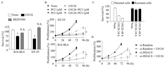 MEK1/2-ERK inhibition is involved in LT-induced cell cycle arrest in B16-BL6 and HT-29 cells. (A) B16-BL6 and HT-29 cells were seeded in 96-well plates for 18 h. Cells were then exposed to U0126 (12.5 µM) or SB203580 (12.5 µM) for 24 h, and cell survival was measured by the MTT assay. (B) Similarly, HT-29 (top panel) and B16-BL6 (bottom panel) cells were seeded in 96-well plates for 6 h. Cell were then treated with U0126 (12.5 µM) with or without PCI-34051 (PCI) for the time indicated. Cell proliferation was measured by the MTT assay. (C) Resistance HT-29 cells were selected after treating U0126 for 72 h. The surviving cells were replated and re-exposed to U0126 for the time indicated. Cell survival was measured by the MTT assay. (D) HT-29 cells were transfected with HDAC8 siRNA or random siRNA for 18 h and then treated with U0126 (12.5 µM) for the time indicated. Cell proliferation was measured by the MTT assay. (A–D) Data are expressed as means and ± SD (n = 3; N.S., not significant; *, p < 0.05 by the Student’s t-test).