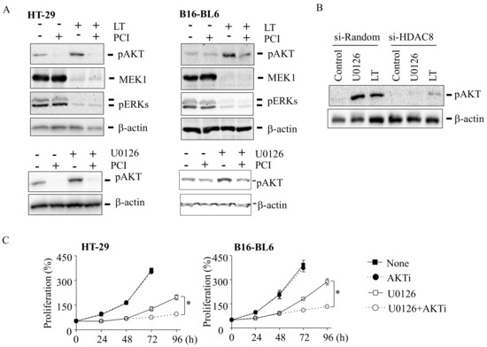 In the absence of ERK activation, cell cycles can be proceeded by activating the AKT pathway [25,26]. Therefore, we examined whether LT and U0126 induced AKT activation and whether it was mediated by HDAC8. HT-29 and B16-BL6 cells were treated with LT or U0126 for 72 h, and the activation of AKT was examined by Western blots using an antibody specific for phosphorylated AKT at Ser-473 [27]. We first examined whether the MEK1/2-ERK signaling axis was inhibited in cells treated with LT for 72 h. Western blots using antibodies raised against the N-terminus (the first 12 amino acids) of MEK1 and phospho-specific ERK readily detected MEK1 and activated ERK in control and PCI-treated cells but not in LT- and LT + PCI-treated HT-29 and B16-BL6 cells (Figure 3A, upper panel). These data suggest that the MEK1/2-ERK signaling axis was inactivated in cells treated with LT for 72 h. In these cells, AKT was highly phosphorylated, which was prevented by PCI. Similarly, U0126-exposed cells showed a robust activation of AKT but not in PCI-exposed cells (Figure 3A, lower panels). Consistent with PCI, knocking down HDAC8 by siRNA also prevented LT- and U0126-induced AKT activation in HT-29 cells (Figure 3B). In addition, the inhibition of AKT by the AKT inhibitor (AKTi) prevented cell proliferation in U0126-resistant HT-29 and B16-BL6 cells (Figure 3C), suggesting that AKT activation was required for a resistance to cell cycle arrest. Altogether, these results suggest that HDAC8-mediated AKT activation is required for a resistance to LT and MEK1/2 inhibition.