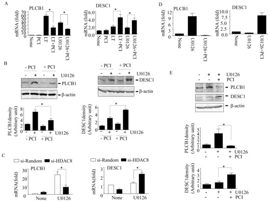 We confirmed that LT and U0126 greatly enhanced the PLCB1 mRNA expression, which was significantly inhibited by PCI through quantitative (q)PCR analysis (Figure 4A, left panel). Consistent with the mRNA levels, the Western blot analysis also showed that U0126 alone induced PLCB1 expression, which was inhibited by PCI (Figure 4B, left panel). Furthermore, HDAC8-targeting siRNAs also recapitulated the effects of PCI, inhibiting and enhancing the expression of PLCB1 in U0126-exposed cells (Figure 4C, left panel). Similarly, LT and U0126, together with PCI, greatly enhanced the DESC1 expression in the mRNA (Figure 4A, right panel) and protein (Figure 4B, right panel) levels. Of note, U0126 alone slightly induced DESC1 in the protein levels but not in the mRNA levels. The discrepancy could be due to the transient upregulation and/or short half-life of DESC1 mRNAs. Additionally, HDAC8-targeting siRNAs had similar effects as PCI in inducing DESC1 expression in U0126-treated cells (Figure 4C, right panel). Like HT-29 cells, B16-BL6 cells also induced the expression of PLCB1 in response to U0126, which was inhibited by PCI, and the expression of DESC1 in response to U0126 + PCI in both the mRNA (Figure 4D) and protein (Figure 4E) levels. These results suggest that HDAC8 is involved in positively and negatively regulating the expression of PLCB1 and DESC1, respectively, in LT- and U0126-resistant cells.