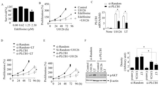 To examine the role of PLCB1 in AKT activation and resistance to MEK1/2 inhibition, the effects of the PLCB1 inhibitor edelfosine [30] and PLCB1-targeting siRNAs were examined in LT- and/or U0126-resistant cells. Edelfosine at a noncytotoxic dose of 1.25 µM (Figure 5A) significantly inhibited cell proliferation in U0126-exposed cells (Figure 5B). Similarly, siRNA-targeting PLCB1 (si-PLCB1), which reduced the PLCB1 expression by 50% (Figure 5C), prevented cell proliferation in LT- and U0126-resistant HT-29 cells (Figure 5D,E). In line with these data, si-PLCB1 prevented AKT activation, which was induced by LT and U0126 (Figure 5F). These results suggest that PLCB1 is required for AKT activation and recovery from cell cycle arrest in LT- and U0126-exposed HT-29 cells.
