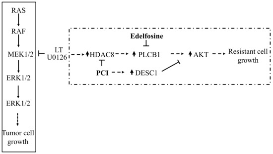 In summary, MEK1/2 inhibitors or the biological agent LT, which can provide more potent and tumor-specific delivery, inhibit tumor cell growth by inhibiting the perpetually activated MEK1/2-ERK cell proliferation pathway (Figure 7, solid box). However, the inhibition of MEK1/2-ERK can lead to AKT activation through HDAC8 (Figure 7, dotted box). We found that HDAC8 induced the PLCB1 expression and subsequent AKT activation in low basal DESC1 expression/activity. The inhibition of HDAC8 prevented PLCB1 expression and, at the same time, increased DESC1 expression, both of which were involved in re-sensitizing cells to MEK1/2 inhibition. Therefore, targeting PLCB1 and DESC1 could be potential strategies for inhibiting the resistance to MEK1/2 inhibition in certain cancers with NRAS or BRAF mutations.
