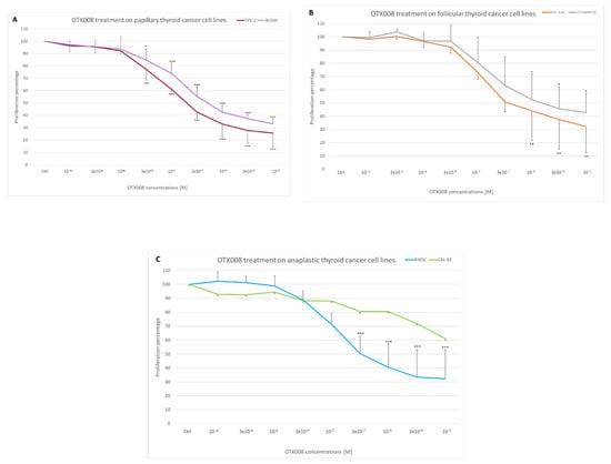 Effect of OTX008 treatment on thyroid cancer cell proliferation. Cells were cultured in 96 well plates and exposed to various concentrations of OTX008 (10−9–10−5 M) for 72 h. Cells were fixed in PAF, stained with crystal violet, solubilized with Triton X-100, and the OD of staining was determined at 570 nm. Data present the concentration–response curves of (A) papillary thyroid cancer cell lines, (B) follicular thyroid cancer lines, and (C) anaplastic lines. Control values were normalized at 100% and compared to treatment values. ANOVA and Dunnett post hoc tests were performed to assess significance (* p < 0.05; ** p < 0.01; *** p < 0.001).