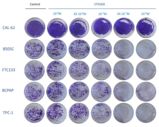 In this experiment, we assessed the long-term effect (10 days) of OTX008 by performing colony formation assays in five thyroid cancer lines (TPC1, BCPAP, FTC133, 8505c, CAL62). Of note, long-term culture was not possible for the TT2609C02 line because adhesion of these cells was too low. After treatment, cells were stained by crystal violet to visualize cell colonies and evaluate the impact of OTX008 on their formation and size. Figure 2 presents the results of the clonogenic assays and shows that colony formation was highly inhibited by 10−6 M OTX008 in all cell lines, except in the CAL62 line, which was largely unaffected by the drug. Of note, colony formation with CAL62 cells was very high, reflecting the aggressiveness of this line.