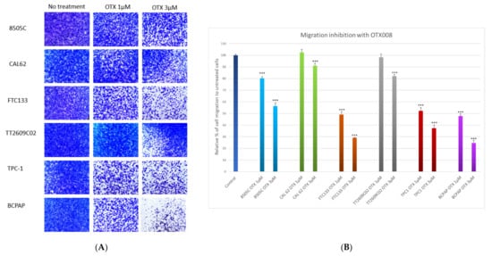 Evaluation of the anti-migrative properties of OTX008 in thyroid cancer cell lines. (A) Cells were plated in a Boyden chamber in media without FBS and with 1 or 3 µM OTX008 for 48 h. (B) The percentage of invasiveness was determined by solubilization with Triton X-100 of invasive cells stained by crystal violet. The quantification was performed by measuring the optical density at 570 nm. Migration values for untreated cells are normalized at 100% for each line and are represented once as Control. Statistical analyses refer to each respective control line. ANOVA and Dunnett post hoc tests were conducted to assess significance compared to respective control cells whose migrations were normalized at 100% (*** p < 0.001).