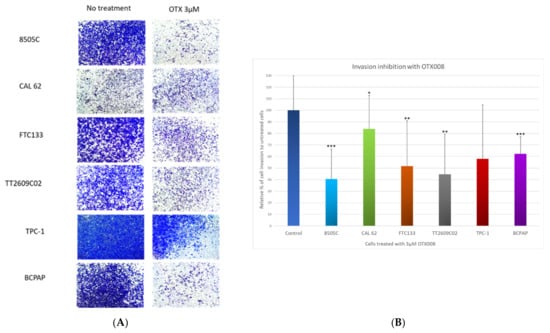 Evaluation of the anti-invasive properties of OTX008 in thyroid cancer cell lines. (A) Cells were plated in a Boyden chamber in media without FBS and with 3 µM OTX008 for 48 h. (B) The percentage of invasiveness was determined by solubilization of invasive cells and quantification of the crystal violet staining at the optical density of 570 nm. Invasion values for untreated cells are normalized at 100% for each line and are represented once as Control. Statistical analyses refer to each respective control line. Student’s t-test was performed to assess significance regarding to respective control cells whose invasion capacity were normalized at 100% (* p < 0.05; ** p < 0.01; *** p < 0.001).