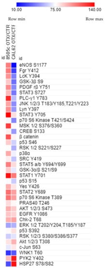 Phosphorylation profiles in anaplastic cell lines. Heatmap showing the phosphorylation level of 37 proteins according to the cell line (8505c vs. CAL 62) and the treatment (30 µM OTX008 30 min vs. CTR). Shades of red represent a high phosphorylation profile and shades of blue correspond to a weak phosphorylation expression.