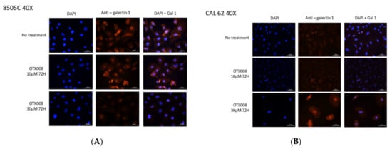 Cells were plated at day 0 in 12 well plates with 1 mL of medium per well. Each well contained a coverslip. Cell densities varied according to conditions (no treatment: 3000 cells/well, 10 µM OTX008: 10,000 cells/well, 30 µM OTX008: 30 000 cells/well). At day 1, drug or vehicle was added to the medium for 72 h. The steps of fixation and antibody incubation were performed at day 4. Cells were washed with PBS and then fixed for 15 min in paraformaldehyde solution. Cells were washed again with a PBS solution containing 0.1% Triton™ X-100 for 3 successive washes of 5 min. A blocking solution of PBS-BSA 5% was added for 1 h at room temperature. Cells were again washed with PBS solution. The primary antibody (Galectin 1 Monoclonal Antibody (6C8.4-1) Thermo Fisher Scientific, Waltham, MA, USA) was added at a dilution of 1:250 in PBS containing 0.5% BSA for 3 h at room temperature (negative control lacked antibodies). Cells were washed 3 times for 5 min with 0.1% Triton™ X-100 in PBS. The secondary antibody (Alexa fluor) 1:100 in PBS containing 0.5% BSA was then added for 30 min at room temperature. Cells were finally washed 3 times with 0.1% Triton™ X-100 in PBS. A Few drops of DAPI solution (ProLong™ Gold Antifade Mountant with DAPI, Thermo Fisher Scientific, Waltham, MA, USA) were added to a glass side, which was then covered by a coverslip. Images were then acquired with NIS element viewer 5.21.