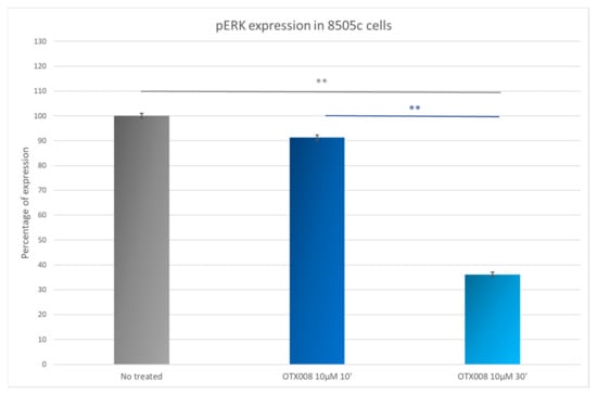 Evaluation of pERK level in 8505c cells. Cells were exposed for 10 and 30 min with 10 µM OTX008. ANOVA and Tukey post hoc tests were performed to assess significance ** p < 0.01).