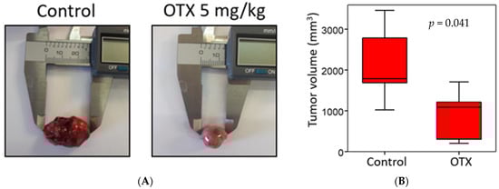 Effect of OTX008 on tumor volume developed from anaplastic cells in nude mice. (A) Illustration of two tumors and (B) box plot presenting tumor volume after mouse euthanasia in both control and OTX-treated groups. The Mann Whitney test was performed to assess significance.