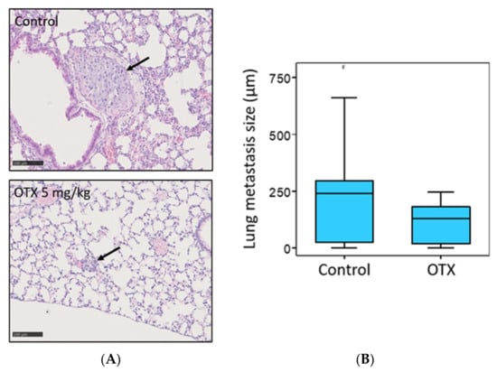The development of lung metastasis was evaluated in the two groups of mice (no treated (control) vs. 5 mg/kg OTX008). After 3 weeks of treatment and euthanasia of animals, lungs were collected, fixed in 4% formaldehyde, and conserved in paraffine. Five 4 µm tissue sections were cut each 40 µM to examine a large part of each lung and were colored with hematoxylin/eosine solution for histological evaluation. The largest size of each metastasis was measured for both experimental groups and results are presented in Figure 10. OTX008 treatment significantly reduced the size of lung metastases.