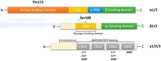 Functional domain of AMPK subunits. AMPK is a heterotrimeric complex composed of a catalytic α subunit(α1/2), regulatory β subunit (β1/2), and γ (γ1/2/3) subunit. AMPKα: kinase domain (KD) at the N-terminal contains Thr172, which is phosphorylated by upstream kinases; AID, auto-inhibitory domain; α-RIM: regulatory subunit interacting motif triggering conformational changes; β-subunit binding domain at the C-terminal. AMPKβ subunit: carbohydrate-binding module (CBM) near the N-terminal contains Ser108, which is important for the mechanism of action of some direct activators of AMPK; C-terminal domain containing the α-subunit-binding site and immediately followed by the domain for the γ-subunit interaction. αγ-binding domain: α-subunit-binding and γ-subunit interaction site at the C-terminal. AMPKγ subunit: cystathione-β-synthases (CBS) domain, which forms two Bateman domains containing four ATP/ADP/AMP-binding sites (CBS1–4).