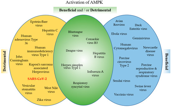 Due to its important role in the cell’s homeostasis, AMPK is an important cellular factor that many viruses utilize for replication, as it involves an energy-dependent process requiring high cellular ATP levels [4,5,6]. Viruses use AMPK to manipulate autophagy [7,8], fatty acid and lipid metabolism [5,9], glucose metabolism [10,11] and many other cellular processes.