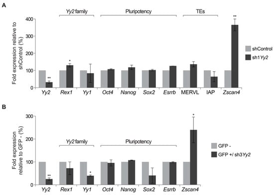 To validate these results, we transfected mESCs with an shRNA against Yy2 containing an EGFP cassette (sh3Yy2) and compared the levels of gene expression of GFP-expressing (GFP+) versus GFP-non-expressing (GFP-) cells by RT-qPCR. As expected, GFP + sorted cells had lower levels of Yy2 compared to GFP-cells (Figure 4B). Similarly to the results obtained in the previous approach, Yy2 family members were somewhat affected in Yy2-depleted cells GFP + cells. While no significant changes were observed for Rex1, Yy1 mRNA levels were significantly downregulated. Consistent with the results shown in Figure 4A, no significant changes in gene expression levels were detected in the pluripotency markers analyzed (Oct4/Pou5f1, Sox2, Nanog, and Esrrb), although the level of Sox2 trended downwards. As before, the Yy2-depleted GFP + cells showed a 2.4-fold increase in Zscan4 levels compared to GFP- cells (Figure 4B). From the combined experiments, we conclude that YY2 contributes to the regulation of Zscan4 levels in mESC.