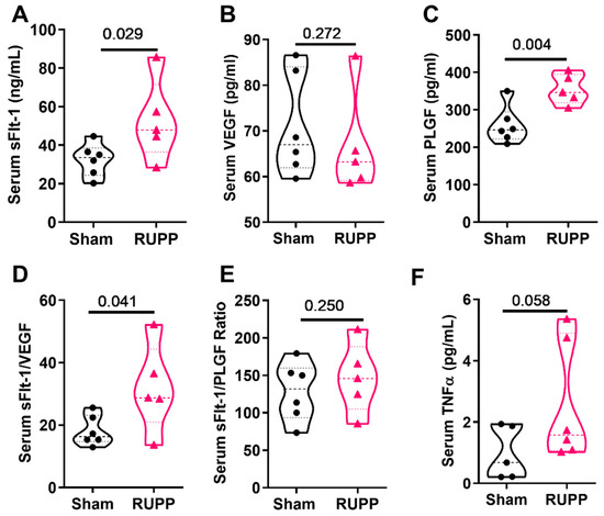 RUPP in the mouse induces some similar changes in angiogenic factors to the rat and preeclampsia patient. RUPP-induced (A) increased sFlt-1, (B) no change in VEGF, (C) increased PlGF, (D) increased sFlt-1/VEGF ratio, and (E) no change in sFlt-1/PlGF ratio in serum samples compared to sham controls. (F) Trend for increased TNFα levels in RUPP mice. Sham n = 6 mice and RUPP n = 5. Data analyzed using unpaired t-test. Points indicate values for individual dams. SFlt—soluble Fms-like tyrosine kinase 1; VEGF—vascular endothelial growth factor; PLGF—placental growth factor.