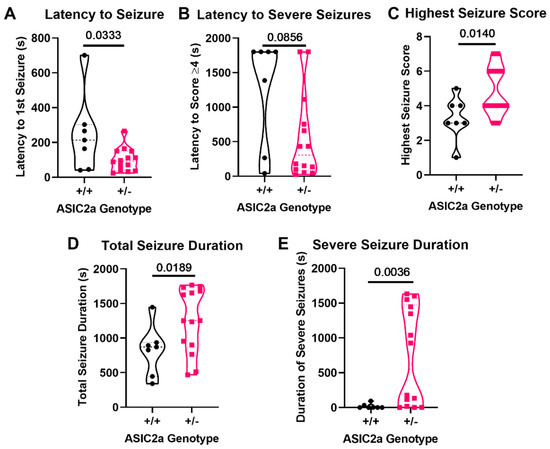 ASIC2a knockdown results in increased seizure severity and longevity in pregnancy. Pregnant ASIC2a+/− mice show (A) significantly reduced latency to the first seizure activity, (B) no difference in reduced latency to severe seizure activity, (C) higher seizure scores, (D) increased total duration of seizures, and (E) increased duration of severe seizures compared to pregnant ASIC2a+/+ mice. n = 7 (+/+) or n = 14 (+/−) mice. Data analyzed using Mann–Whitney U test. Points indicate values for individual dams.