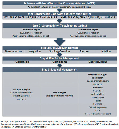 - Bairey Merz, C.N.; Pepine, C.J.; Walsh, M.N.; Fleg, J.L. Ischemia and No Obstructive Coronary Artery Disease (INOCA): Developing Evidence-Based Therapies and Research Agenda for the Next Decade. Circulation 2017, 135, 1075–1092. [Google Scholar] [CrossRef]