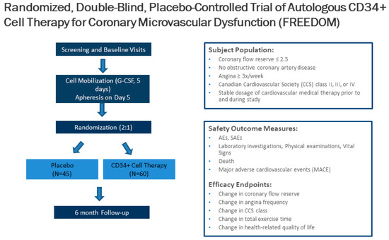 Unfortunately, 25% of patients with INOCA have refractory angina despite medications. Cell therapy using autologous stem cells expressing CD34+ is a novel therapeutic option for these INOCA patients with CMD and refractory angina. The recent two-center ESCaPE-CMD trial (NCT03508609), sponsored by Caladrius Biosciences, evaluated the efficacy and safety of autologous CD34+ cell therapy in 20 INOCA patients with endothelial-independent CMD, defined as CFR ≤ 2.5, and refractory angina [21]. Patients received G-CSF for 4 days followed by leukapheresis, but, in contrast to the previous refractory angina trials, the CD34+ cells were delivered via an intracoronary route. The study showed that a single intracoronary infusion of autologous CD34+ cells significantly increased the CFR from 2.08 ± 0.32 at baseline to 2.68 ± 0.79 at 6 months after treatment (p = 0.0045). This correlated clinically to decreased AF (4.42 to 2.02, p = 0.0036), improved CCS class (3.2 to 2.05, p < 0.001), and improved Seattle Angina Questionnaire (SAQ) and 36-item short-form survey (SF-36) scores (Figure 3) [21]. As with the previous CD34+ clinical trials, there were no cell-related adverse events, demonstrating the excellent safety and tolerability of CD34+ infusions. This study extends the prior findings from the pooled analysis of trials in patients with obstructive CAD and refractory angina, to INOCA patients with CMD and persistent angina. This has led to the phase 2, randomized, double-blinded, placebo-controlled FREEDOM trial (NCT04614467), sponsored by Caladrius Biosciences. The trial began enrollment in October 2020 with an anticipated 105 patients randomized 2:1 to CD34+ cell therapy, to establish a potential therapeutic role for endothelial progenitor cells in INOCA patients with endothelial-independent CMD (Figure 4). A single infusion of autologous CD34+ cells will be administered intracoronary. Patients in the treatment and placebo arms will undergo G-CSF cell mobilization, apheresis, and the intracoronary infusion of autologous CD34+ cells vs. placebo. The primary endpoint is a change in CFR at 6 months.