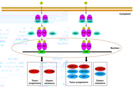 ER signaling in bladder cancer cells. Estrogens have been suggested to modulate tumor progression, as well as chemoresistance, through the ERα and/or ERβ pathways via up-regulating (red) or down-regulating (blue) the molecules listed. E, estrogen; ERE, estrogen response element; HSP, heat shock protein.