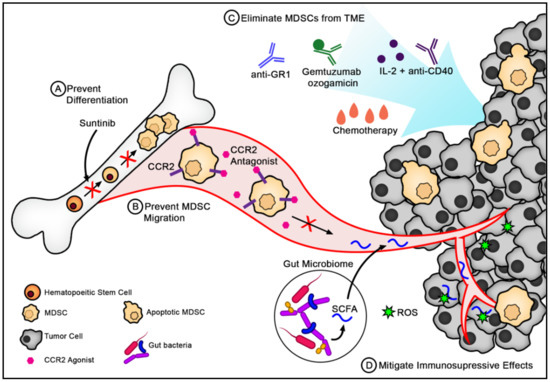 Strategies for targeting MDSCs in cancer. (A) Preventing differentiation of hematopoietic stem cells into MDSCs. Sunitinib is a tyrosine kinase inhibitor that inhibits VEGF and STAT3 activity, both of which are crucial in the differentiation and expansion of MDSCs. (B) Preventing MDCSs from migrating to the tumor. Chemokines such as CCL2 are critical for the recruitment of MDSCs to the TME. As CCL2 binds CCR2 on the surface of MDSCs, specific CCR2 antagonists can hinder the migration to MDSCs toward the TME. (C) Eliminating MDSCs from the tumor by using a variety of immunotherapies and chemotherapy. MDSCs express surface molecules such as Gr1, CD33, and CD40, which provide a target for MDSC depleting antibodies such as anti-Gr1, gemtuzumab ozogamicin (GO), and anti-CD40, respectively. While chemotherapies such as 5-fluorouracil do not specifically target MDSCs, they can effectively eliminate MDSCs through apoptosis. (D) Mitigating the immunosuppressive effects of MDSCs at the tumor site. The gut microbiota is capable of producing short-chain fatty acids (SCFAs), which can limit the toxicity associated with ROS produced by MDSCs.