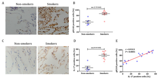The characteristics of patients enrolled in this study are presented in Table S1. We first quantified the degree to which the so-called DDR was associated with smoking, as measured using immunohistochemistry for gH2AX in human lung tissue (Figure 1A). The results showed that the gH2AX expression in the lungs of smokers was 1.54-fold higher than in non-smokers (t = 5.190, p = 0.0001; Figure 1B). In our prior study, we demonstrated that Tc17 cells are associated with CS-induced lung inflammation and emphysema [5]. The main function of IL-17 is to coordinate local tissue inflammation via the regulation of pro-inflammatory cytokines [8]. Based on these premises, we investigated the expression of IL-17 in smokers and non-smokers. Interestingly, IL-17 was observed mainly in the lung specimens of smokers (Figure 1C). The expression of IL-17 was significantly increased in the lungs (t = 6.334, p < 0.0001; Figure 1D) of smokers compared to those of non-smokers. Moreover, IL-17 expression was strongly correlated with gH2AX (r = 0.9313, p < 0.0001; Figure 1E).