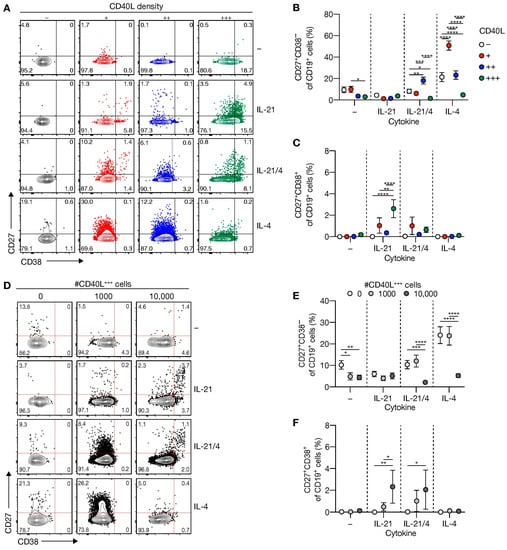 3.2. The Level of CD40 Costimulation in Crosstalk with IL-4/IL-21 Signaling Regulates Differentiation of Human Naive B Cells into CD27+CD38− B Cells and Antibody-Secreting Cells