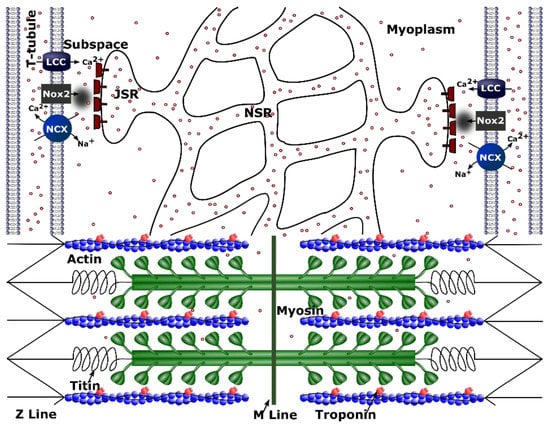 Studies have suggested that in cardiac myocytes, there is an abrupt increase in force after stretching (rapid response) and a slower response that evolves over several minutes (slow force response). A potential mechanism for the slow force response has been suggested, including the activation of stretch-activated non-specific cation channels and paracrine/autocrine signaling. The slow force response has been shown to be helpful in normal function and detrimental in diseases such as heart failure []. In the rapid response, when the heart muscle is stretched, there is an increase in force seen in the same action potential. Previous studies have suggested that this is due to a decrease in myofilament overlap and an increase in the Ca2 sensitivity of the myofilaments (i.e., troponin) []. Our previous studies have shown that the X-ROS mechanism can contribute to both the rapid response and the slow frequency response []. The X-ROS mechanism causes stretching just prior to a contraction to result in the optimal augmentation of contraction. This response is attenuated upon subsequent beats but does contribute to be helpful in normal function. With oxidative stress, which is common in heart failure, the X-ROS mechanism is stronger and contributes to larger Ca2+, which might be arrhythmogenic [,]. The inclusion of length-dependent changes in troponin Ca2+ binding affinity lessens this response through increased buffering during stretch but will not abolish it completely. In other diseases such as Duchenne muscular dystrophy, X-ROS signaling has been suggested to play a role in triggering spontaneous Ca2+ release, which can lead to arrhythmias [].